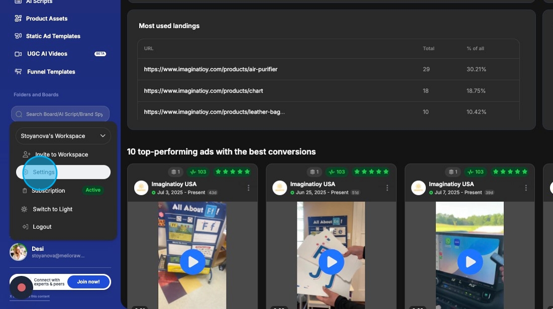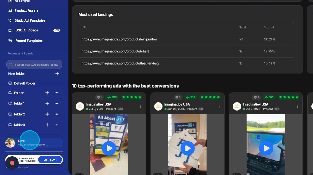 - Usage by Feature β A list showing which features youβve used credits on (e.g., Brand Spy, AI Scripts, AI Image Ads), along with the amount consumed for each.