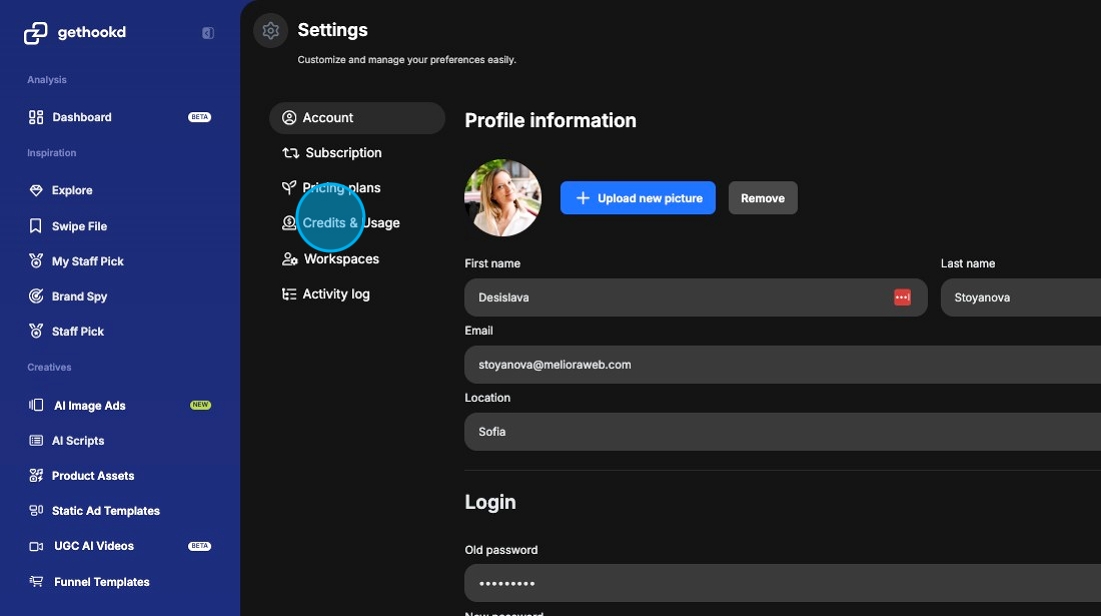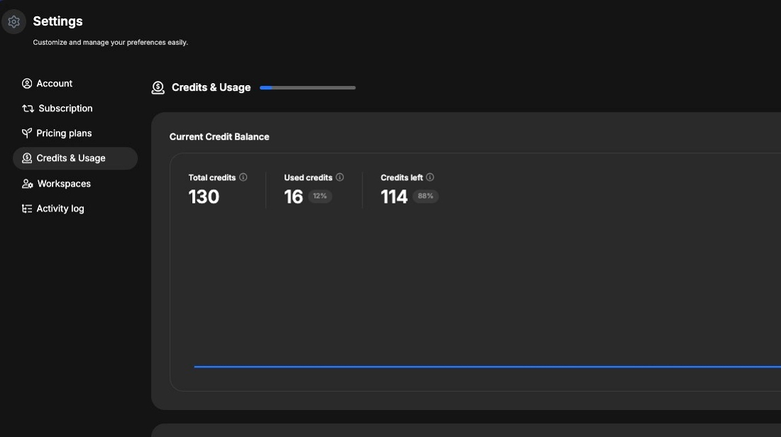 In Account Settings β Credits & Usage, you can see a detailed breakdown of your credit activity. This section shows: