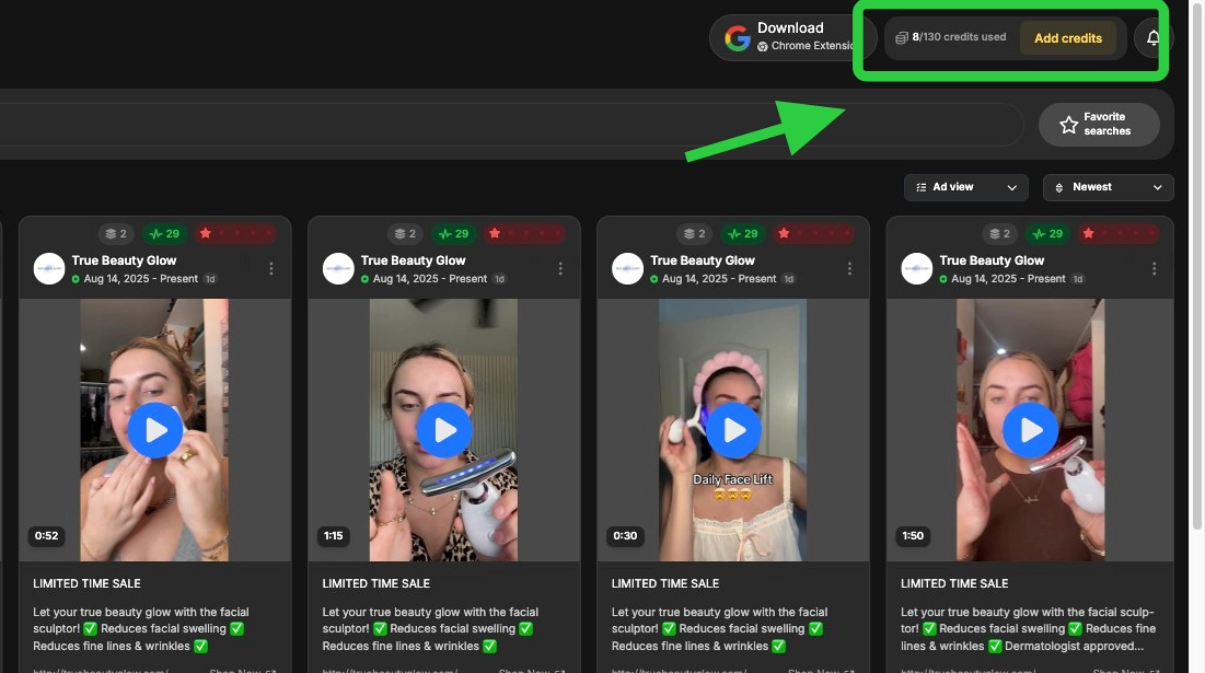 - Navigate to the top right corner of any page throughout the app to check your credits balance.