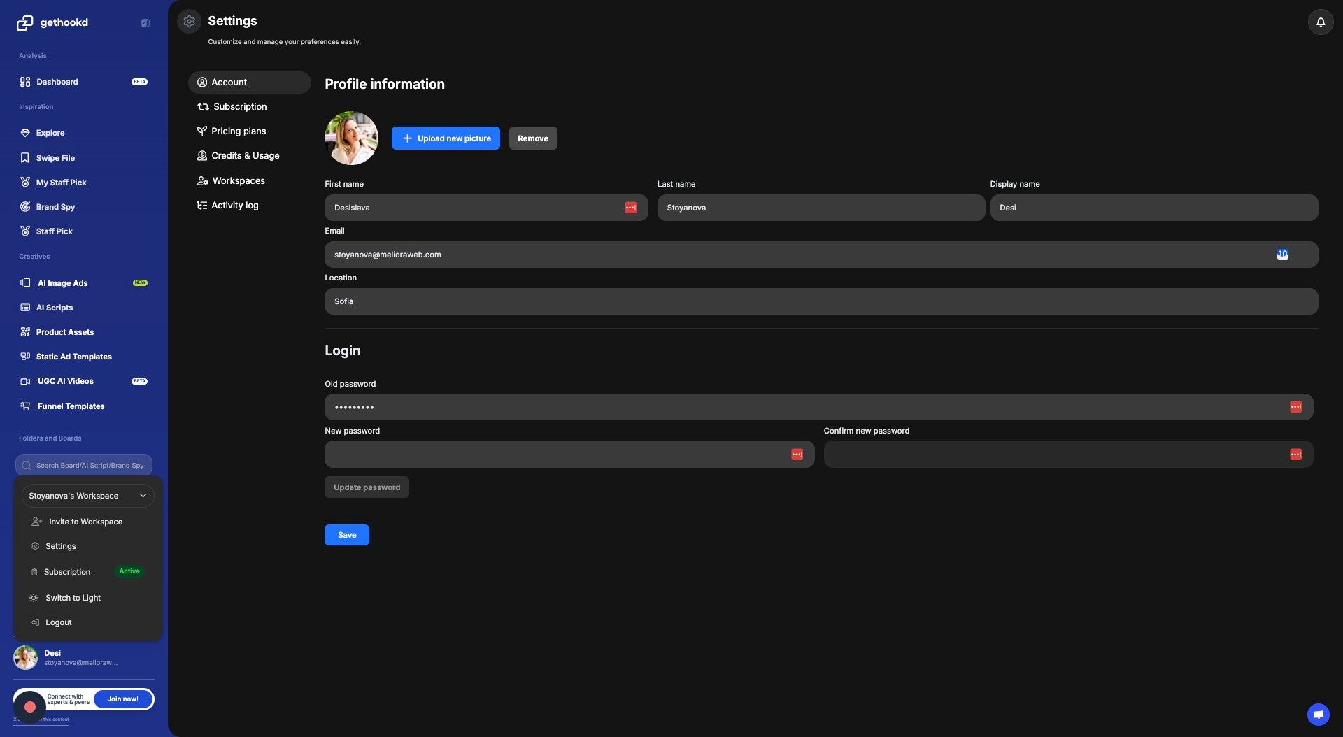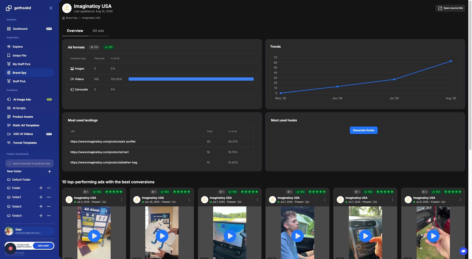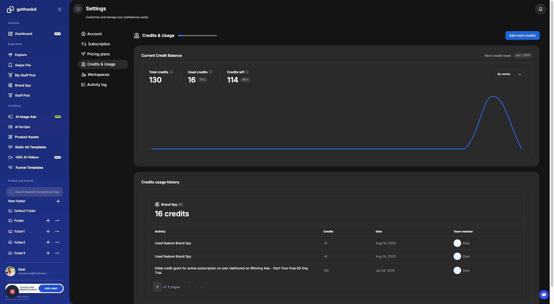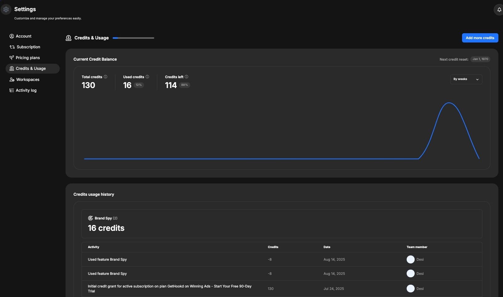 - Usage by Feature β A list showing which features youβve used credits on (e.g., Brand Spy, AI Scripts, Clone Ads), along with the amount consumed for each.